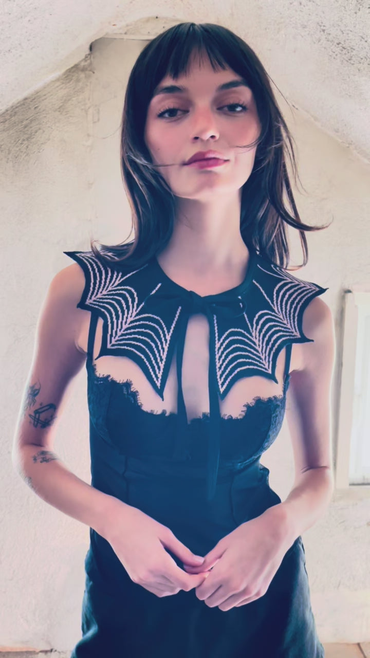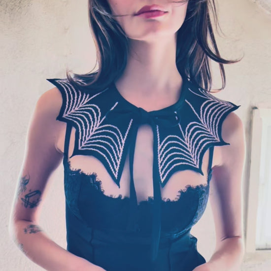 This collar is embraced with spiderweb art & scalloped edges. Ties in front to close.