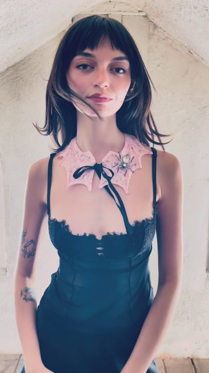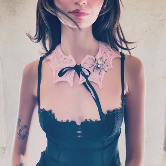 Our beloved Bat Collar now being spun from floral lace by the spider brooch that adorns it...