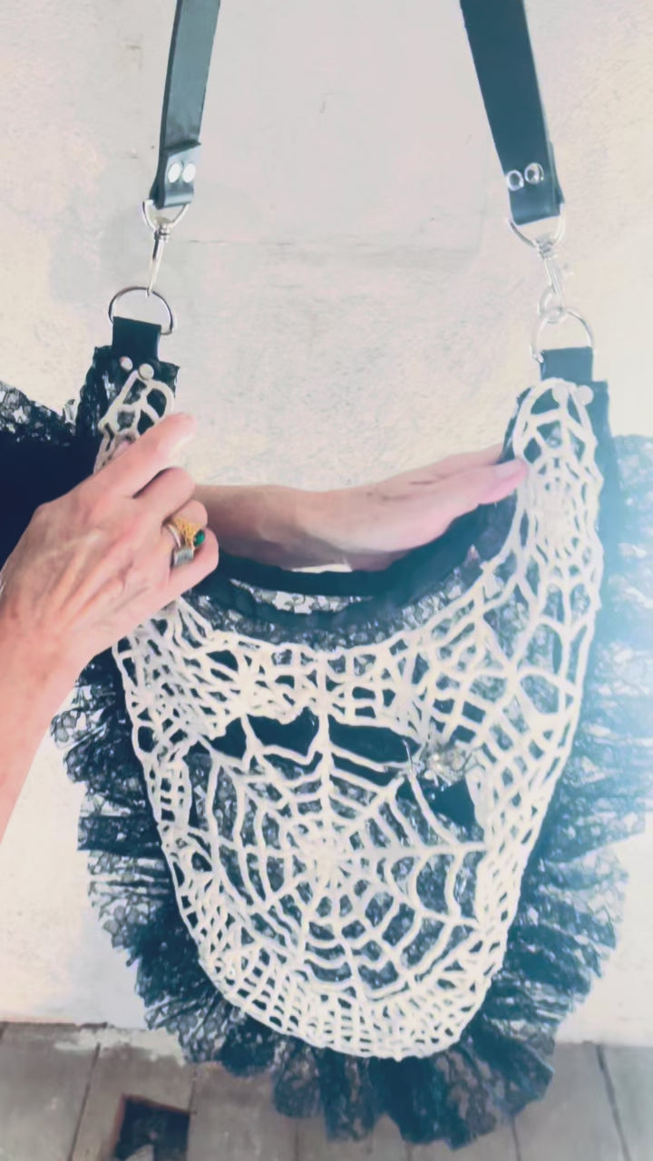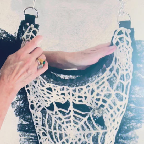 Adorn yourself with your own web, our Black Widow Bag is crafted with the same love and expertise as that of the eight legged creature. These stunning knitted webs are backed with lace and a thin PVC lining to preserve its beauty, it is that completed with a deliciously full gathered lace trim, an interior pocket, a genuine leather strap, and of course a gorgeous spider brooch.